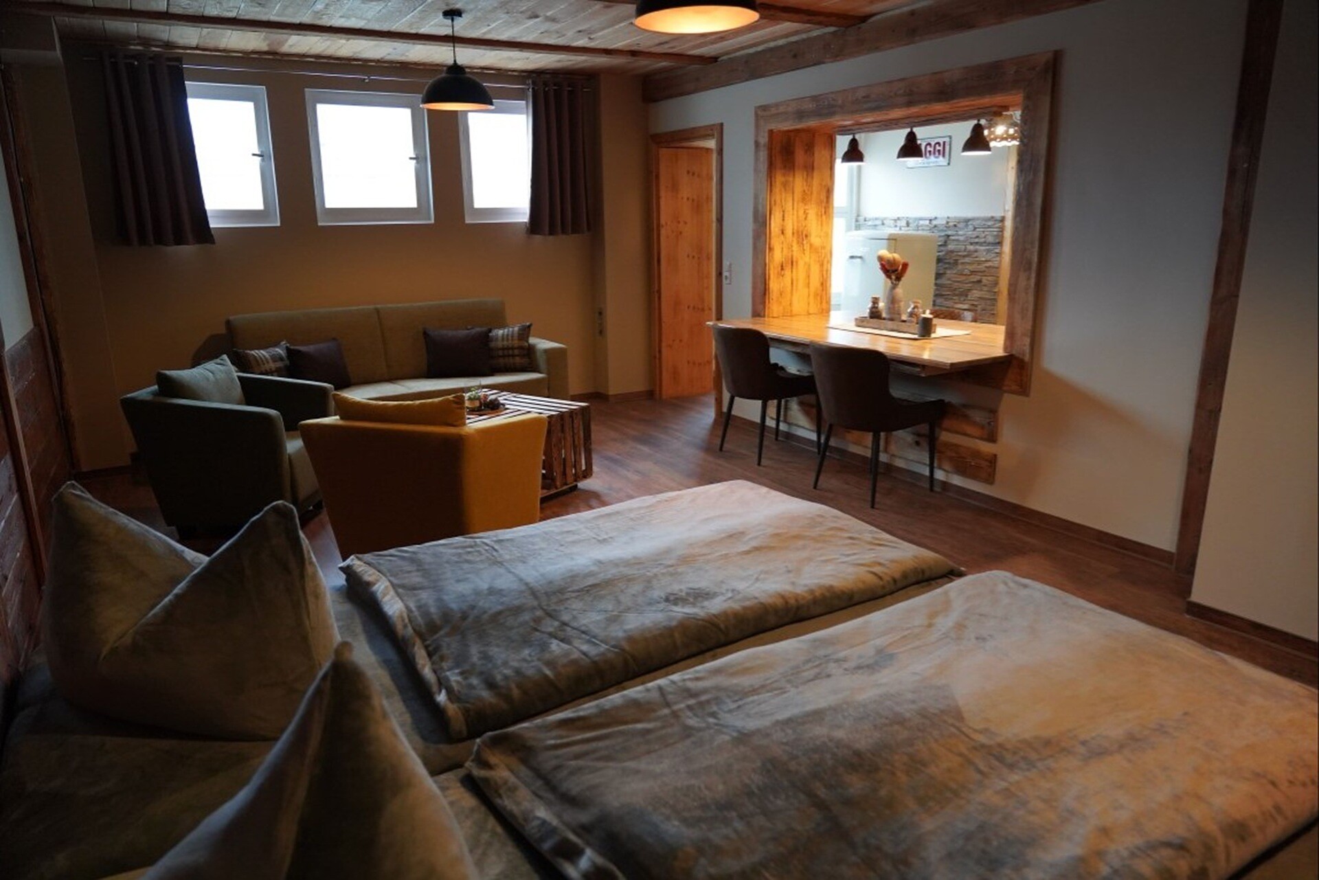 2 Doppelzimmer; 1 Familienzimmer mit Wohn- und Schlafzimmer und separatem Schlafzimmer; 1 Ferienwohnung mit Küche.