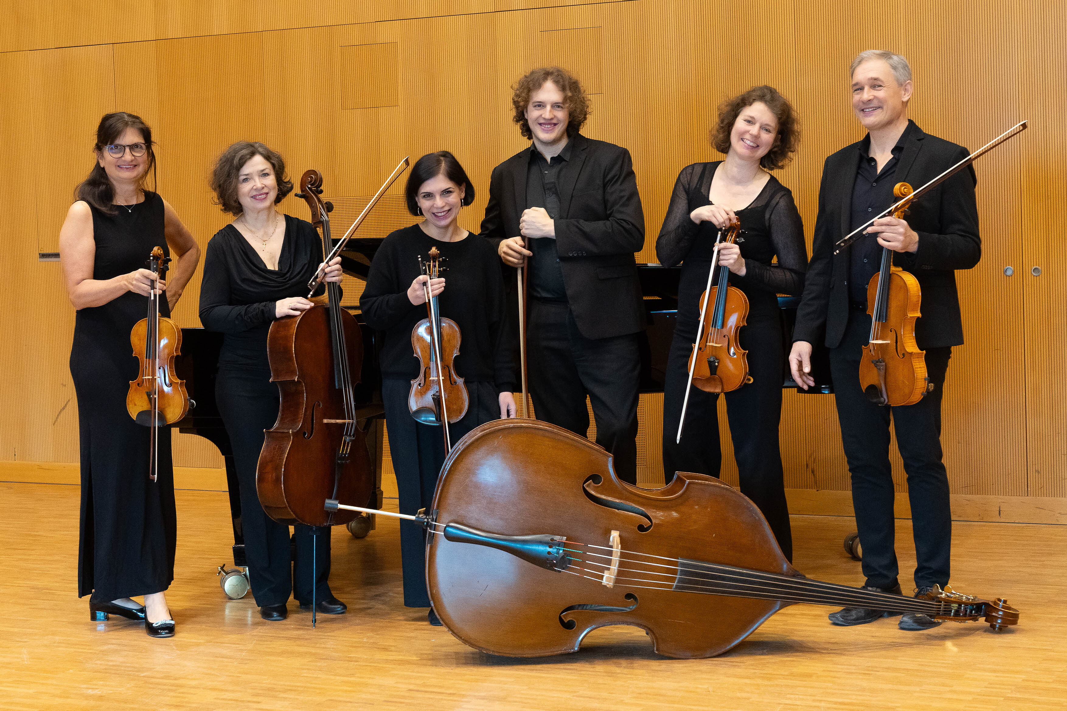 **Mit** Jasmin Badalian (Violine), Miriam Hagen (Violine), Katrin Jordt (Violine), Matthias Schella (Bratsche), Elena Iskraut (Violoncello), Sebastian Pini (Kontrabass) und Maria Anisonyan (Klavier)