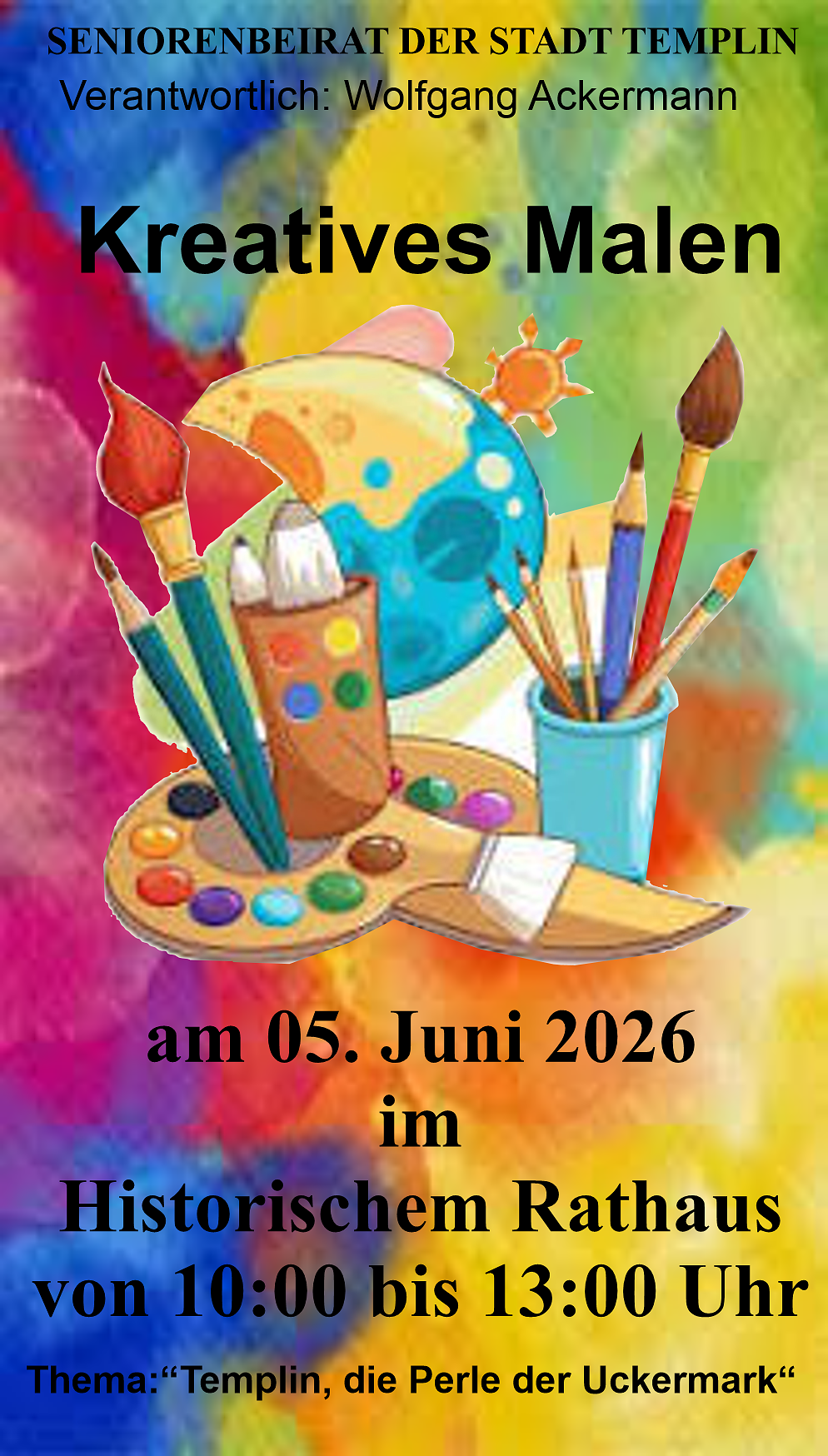 ** _Kreatives Malen_** findet am 05.06.2026 in der Zeit von 10:00 Uhr bis 13:00 Uhr im Historischen Rathaus im großen Saal des Seniorenklubs statt. Sämtliche Materialien wie Leinwände, Farben, Pinsel usw. werden kostenfrei gestellt. Jeder kann mitmachen! Die Veranstaltung findet parallel zum “Tag der offenen Tür“ im Seniorenklub und zum Wochenmarkttag statt. Kaffee und Kuchen bereiten die Mitglieder im Seniorenklub. Die Veranstaltung ist kostenfrei. Wenn gewünscht erfolgt eine Anleitung.
