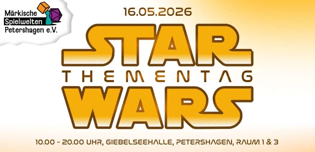 Der Verein Märkische Spiewelten lädt zum Star Wars Thementag ein. Sie haben unter anderem Folgendes auf dem Datascreen: Full Thrust Starship Cambat Game - Starwars Edition; Onepagerrules - "Grogu im Sumpf" / ein Starwars Mini Game, "Der Mandalorianer und die schwarze Sonne" Startwars Lego Tabletop; X-Wing Rollenspiel Oneshot im Starwars Universum.