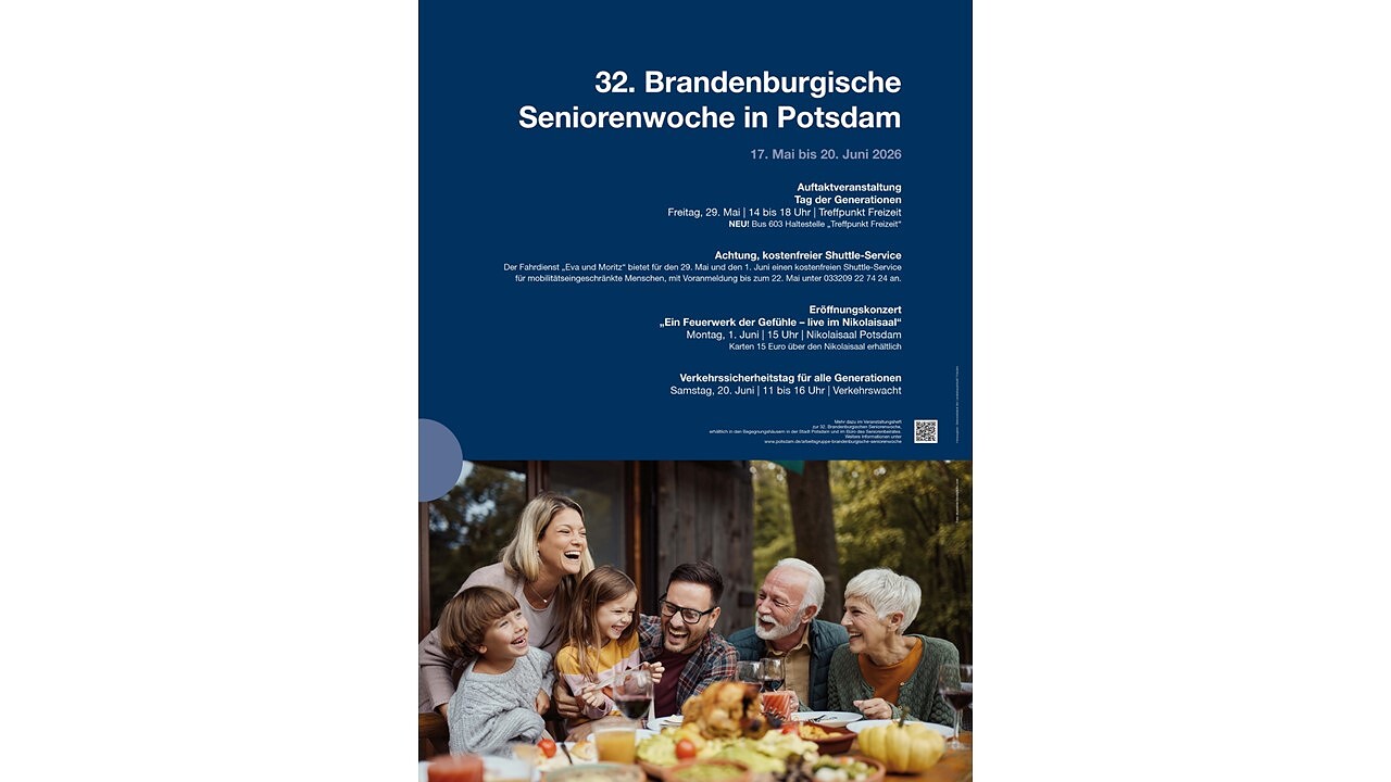 Gemeinsam mit dem Treffpunkt Freizeit eröffnet der Seniorenbeirat der Landeshauptstadt Potsdam die 32. Brandenburgische Seniorenwoche mit einem bunten Tag der Generationen. Gäste können sich an zahlreichen Informationsständen zu Themen wie Soziales, Wohnen, Freizeit, Prävention, Gesundheit und Pflege informieren, beraten lassen und miteinander ins Gespräch kommen. Ergänzt wird das Angebot durch Stände von Feuerwehr und Polizei sowie durch Podiumsdiskussionen zu aktuellen Fragestellungen.
