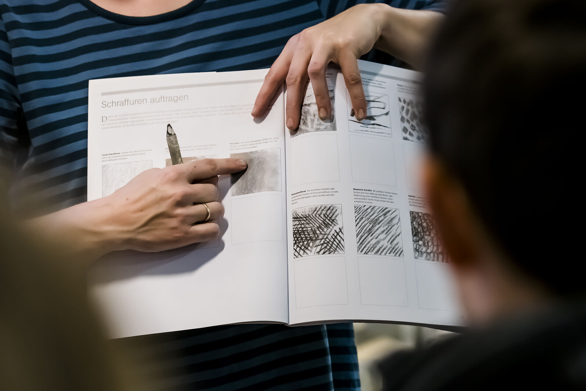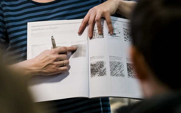 • Katrin Neubert erklärt, wie man mit dem Bleistift Strukturen und Schattierungen erzeugt, Foto: David Marschalsky, Lizenz: Naturkundemuseum Potsdam