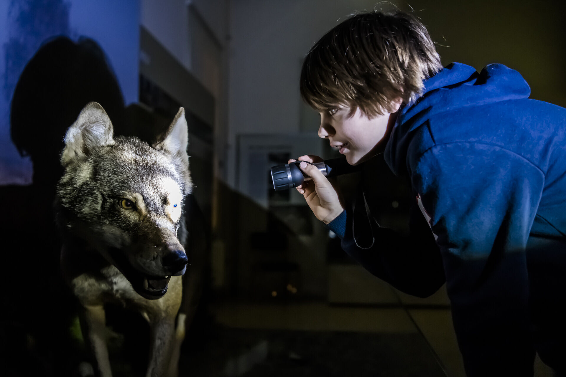 • Hallo Wolf - nachts im Museum mit der Taschenlampe, Foto: D. Marschalsky, Lizenz: Naturkundemuseum Potsdam