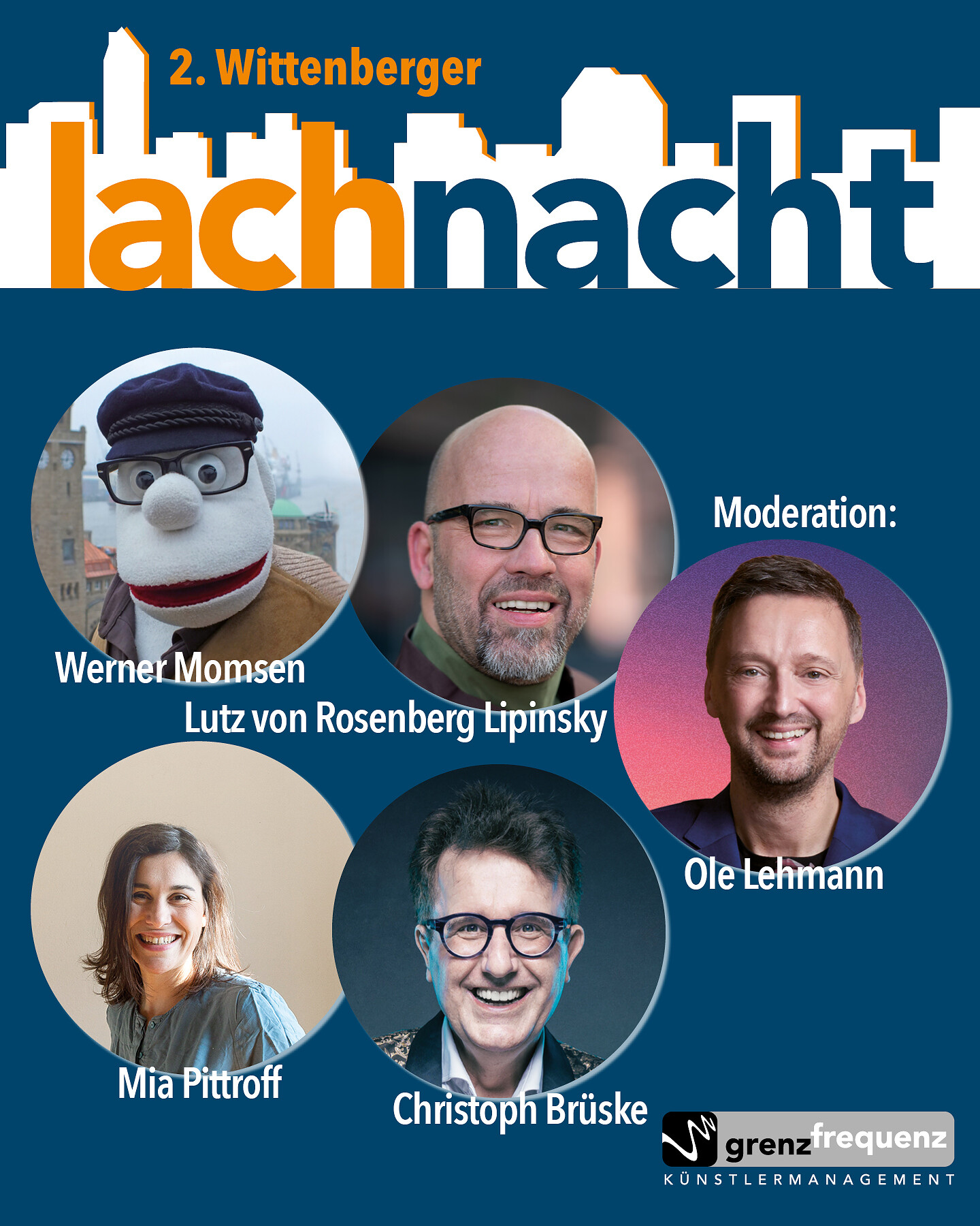 Am 19. März 2026 wird in Wittenberge wieder gelacht! Unter der Moderation von Ole Lehmann, bekannt aus dem Quatsch Comedy Club, präsentieren die besten Comedians und Kabarettisten Deutschlands ein Feuerwerk der Kleinkunst. Mit dabei sind Werner Momsen, die kultige Puppe aus Hamburg, die mit scharfem Humor jede Bühne aufmischt; Lutz von Rosenberg Lipinsky, „Deutschlands lustigster Seelsorger“, der die deutsche Demokratie humorvoll unter die Lupe nimmt; Mia Pittroff, die mit klugen, pointierten Beobachtungen zwischen Provinz und Großstadt begeistert; und Christoph Brüske, der „Verbaltaifun aus dem Rheinland“, der mit Wortwitz und Musik über Gesellschaft und Generationen überzeugt. Ein Abend voller Pointen, Satire und Comedy – Lachen garantiert!
