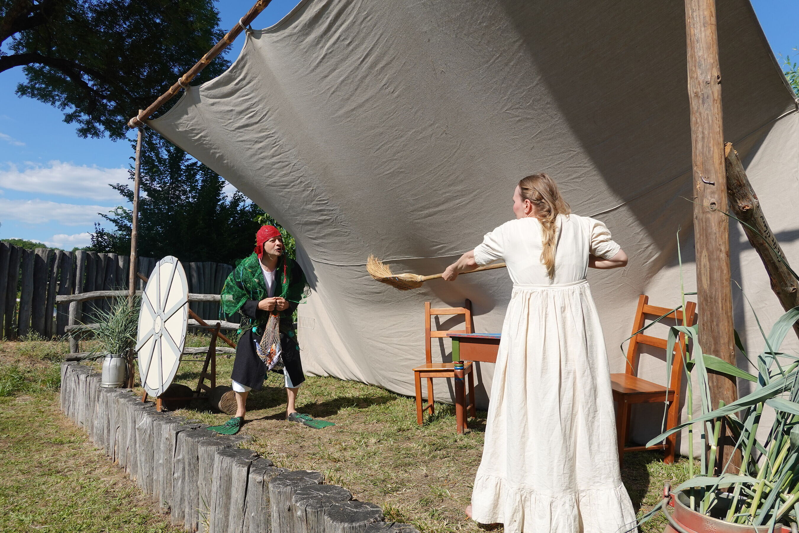 Alle großen und kleinen Märchenfans kommen hier auf Ihre Kosten. 1 Erzähltheater, ein Puppentheater, Märchenerzähler verführen die Gäste in die Welt der Slawischen Märchen, egal ob sorbische, tschechische oder polnische Märchen und Sagen, die fast immer in deutscher Sprache, aber manchmal auch in Sorbisch erklingen. Hier taucht jeder in seiner Fantasie in diese Zauberwelt ein. Es ist ein Fest für die ganze Familie die auf diesem Gelände einen ganzen Tag verbringen können, denn wir laden zu historischen Kinderspielen ein, Märchenfiguren können gebastelt werden und man kann sich selbst in eine Märchen- und Sagenfigur verwandeln.