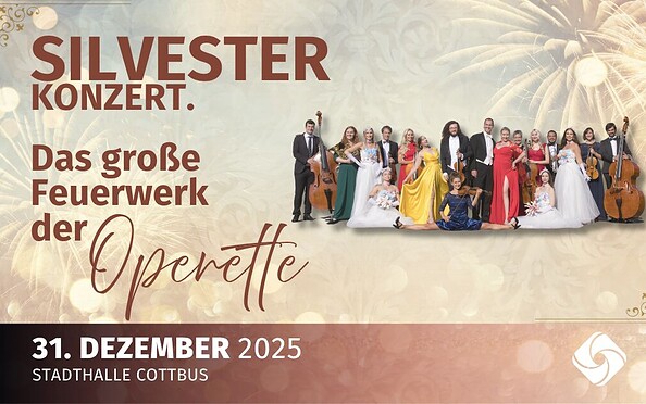Das Jubiläumsjahr der Stadthalle Cottbus möchten wir mit einem besonderen Silvesterkonzert ausklingen lassen. „Das große Feuerwerk der Operette“ verspricht einen unterhaltsamen Silvesterabend mit einer bunten Mischung aus fröhlichen Melodien, humorvollen Szenen und festlicher Atmosphäre.