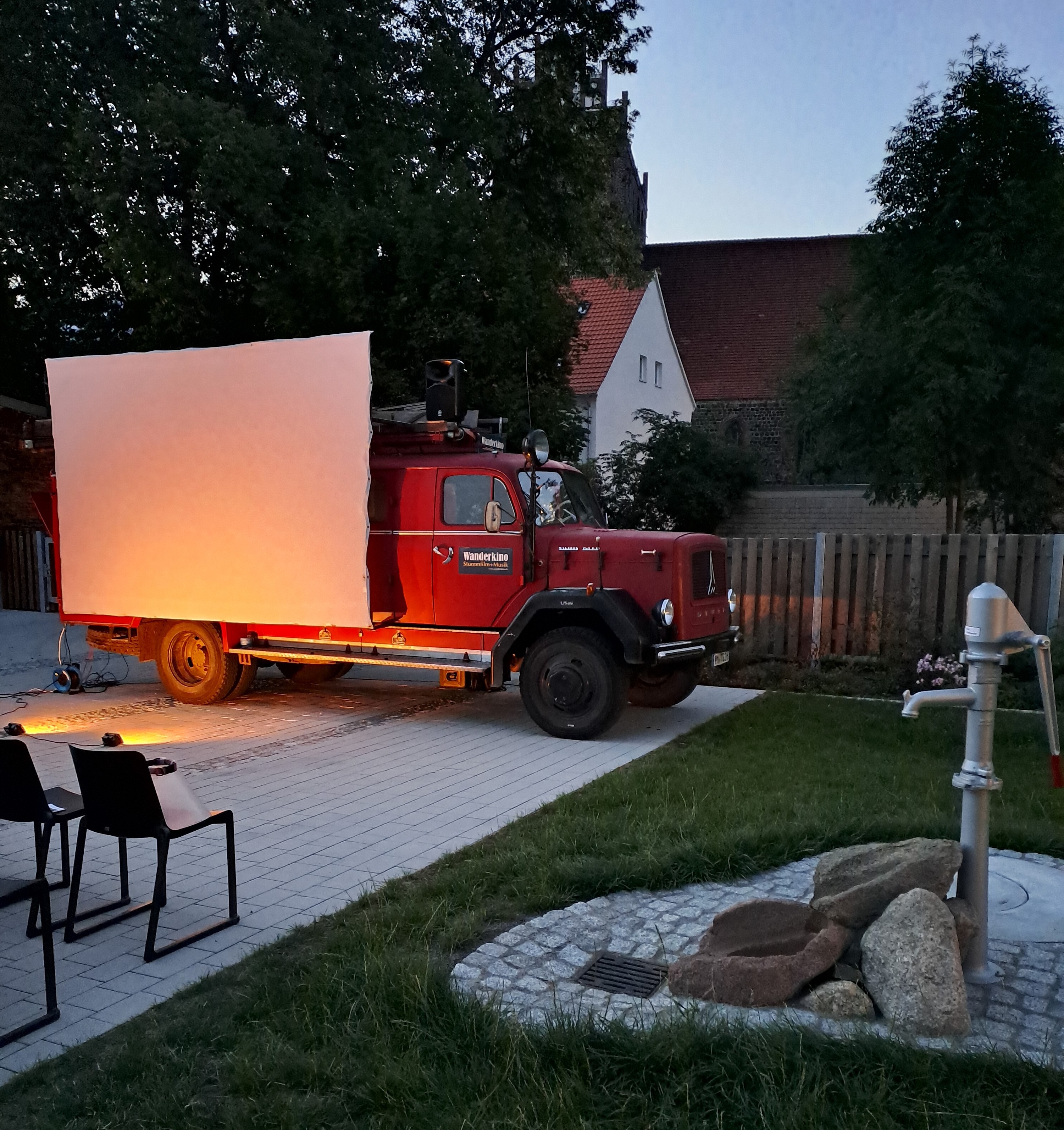 Kino im Bürgergarten Angermünde im historischen Stadtkern mit Blick auf Fachwerkhäuser und die beeindruckende St. Marienkirche.